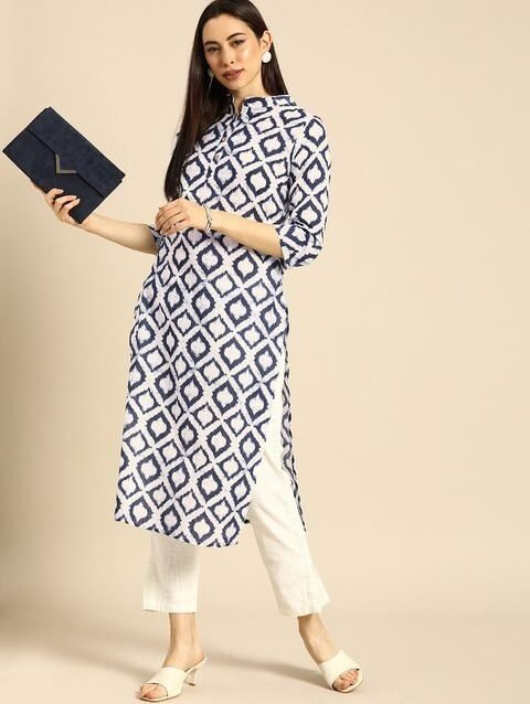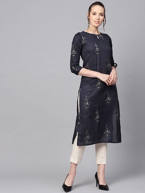 AHIKA Women Navy Blue & Off-White Printed Straight Kurta