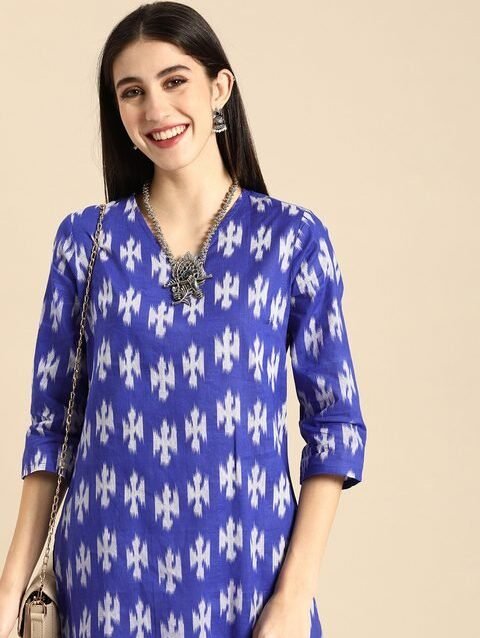 Anouk Women Blue & White Ikat Printed V-Neck Pure Cotton A-Line Kurta