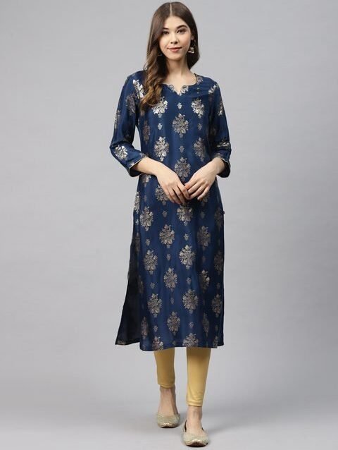 Biba Women Navy Blue & Golden Printed Straight Kurta