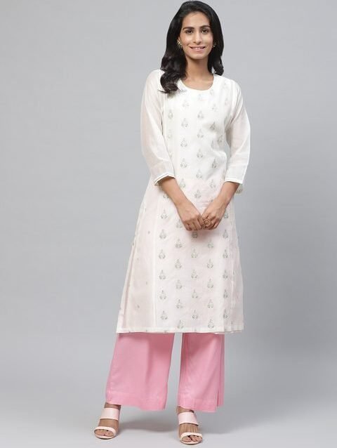 Biba Women Pink & Silver Ethnic Embroidered Straight Kurta
