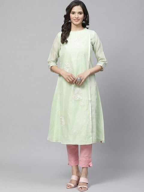 Biba Women Sea Green & White Embroidered A-Line Kurta