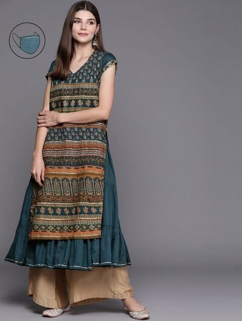 Biba Women Teal Ethnic Motifs Printed Kurta with Mask