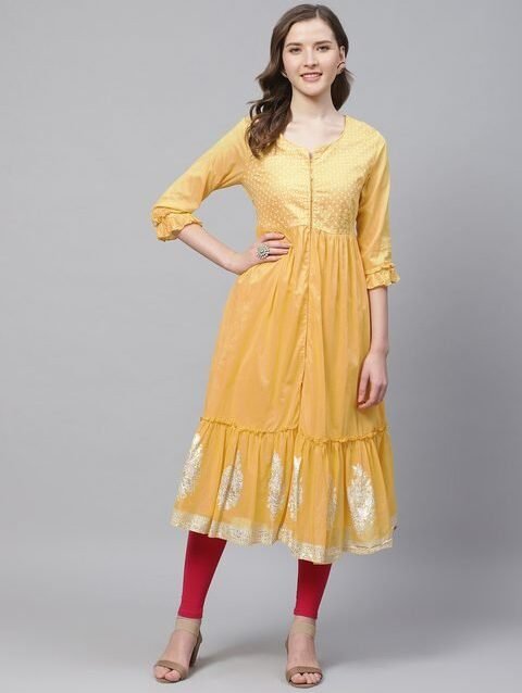 Biba Women Yellow & Pink Printed Layered Tiered A-Line Kurta