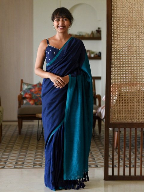 Suta Teal blue & Yellow Colourblocked Zari Saree