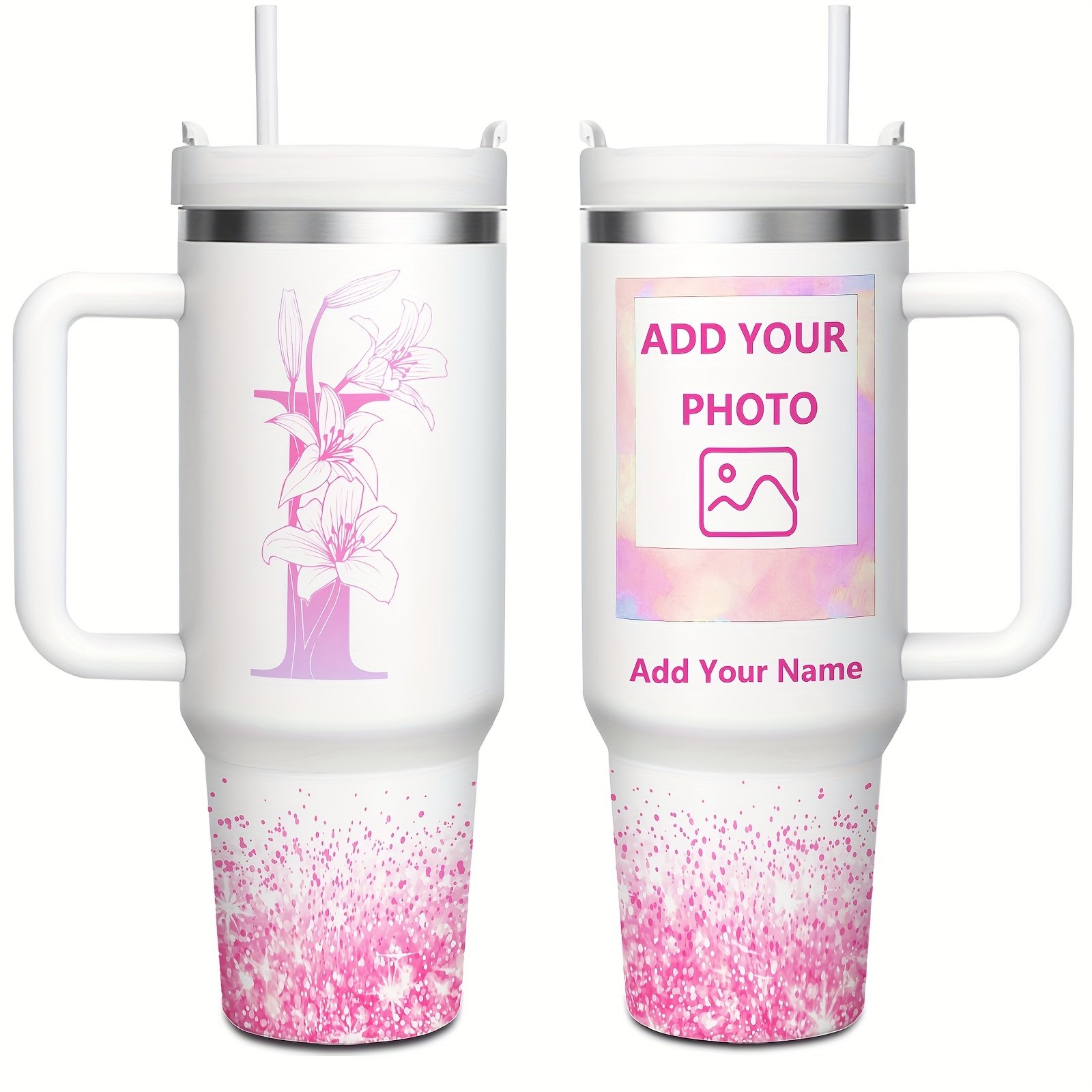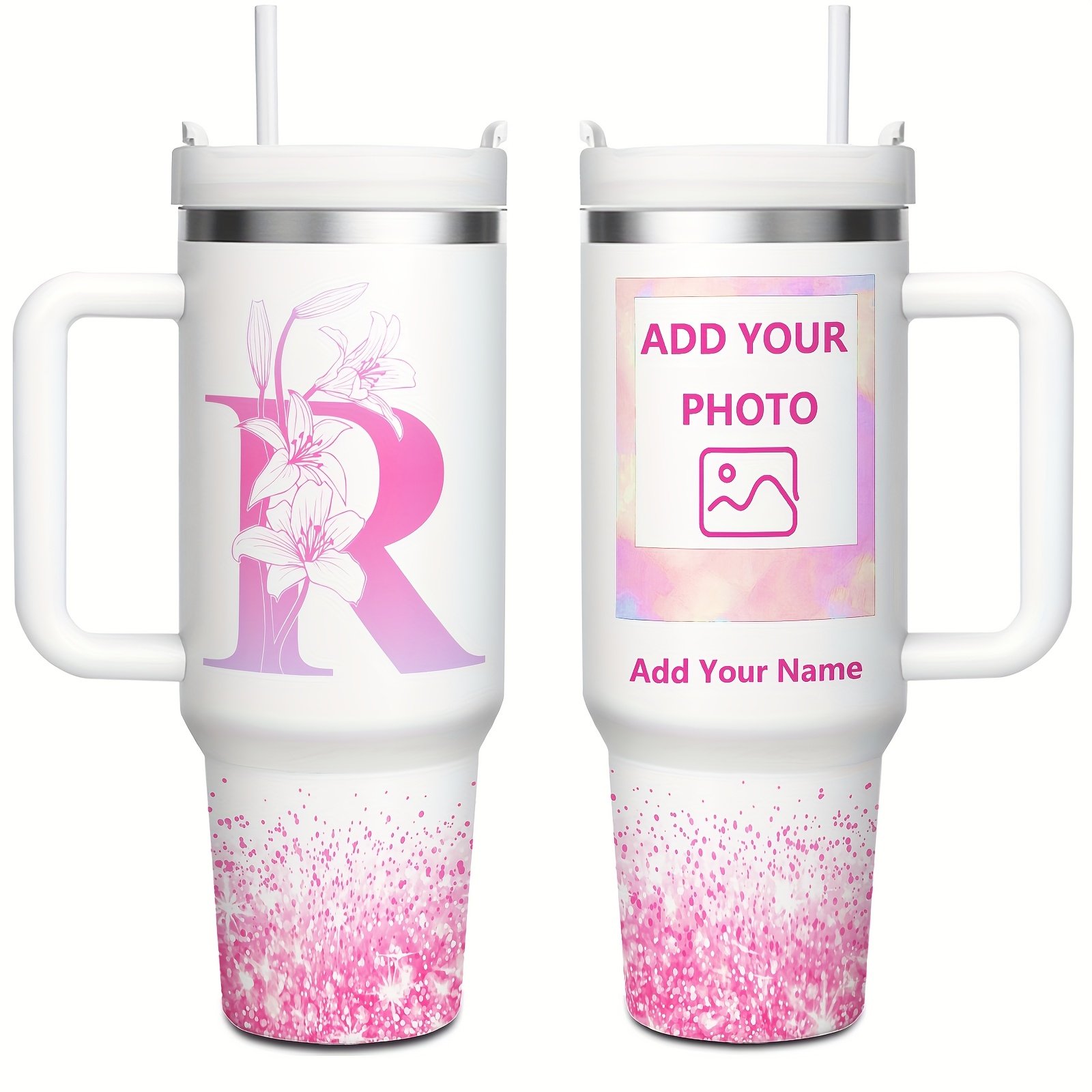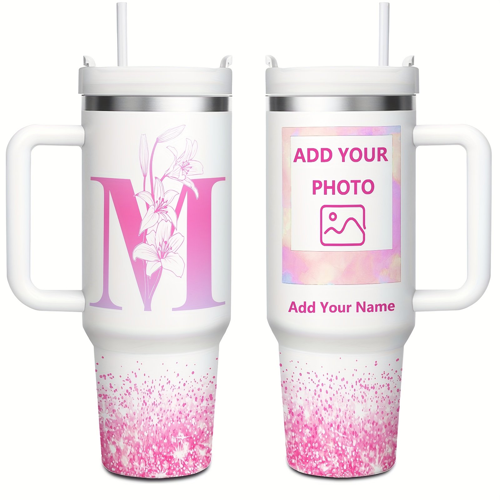 1pc 16oz/40oz Custom Photo And Name Stainless Steel Vacuum Mug with Lid And Straw, Keeps Hot 6h Cold 12h, A-Z Floral Letters, Great Gift for Women, Friends, Mom, Nurses, Perfect for Holidays, Kitchen Accessories, Multi-purpose, Independence Day Gift