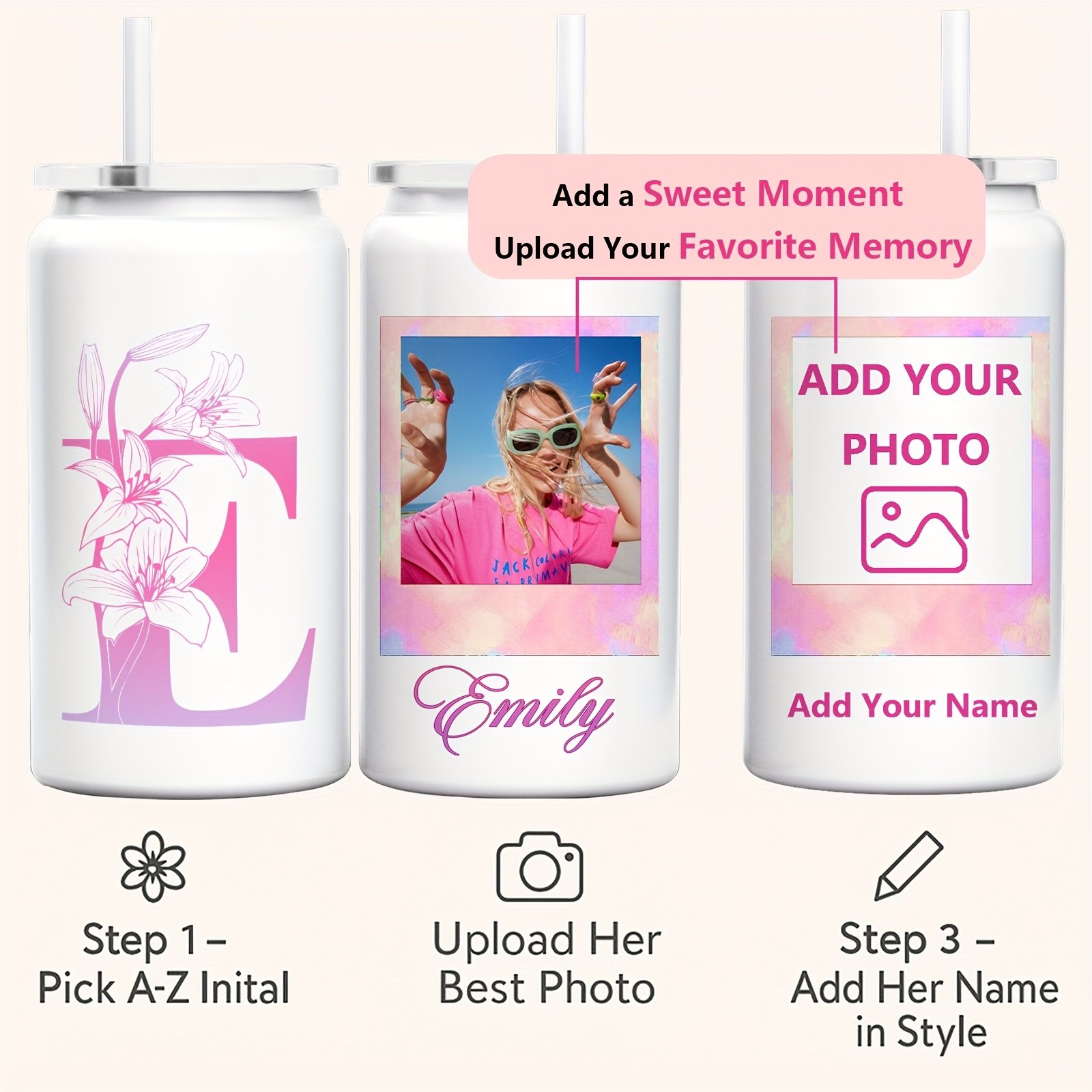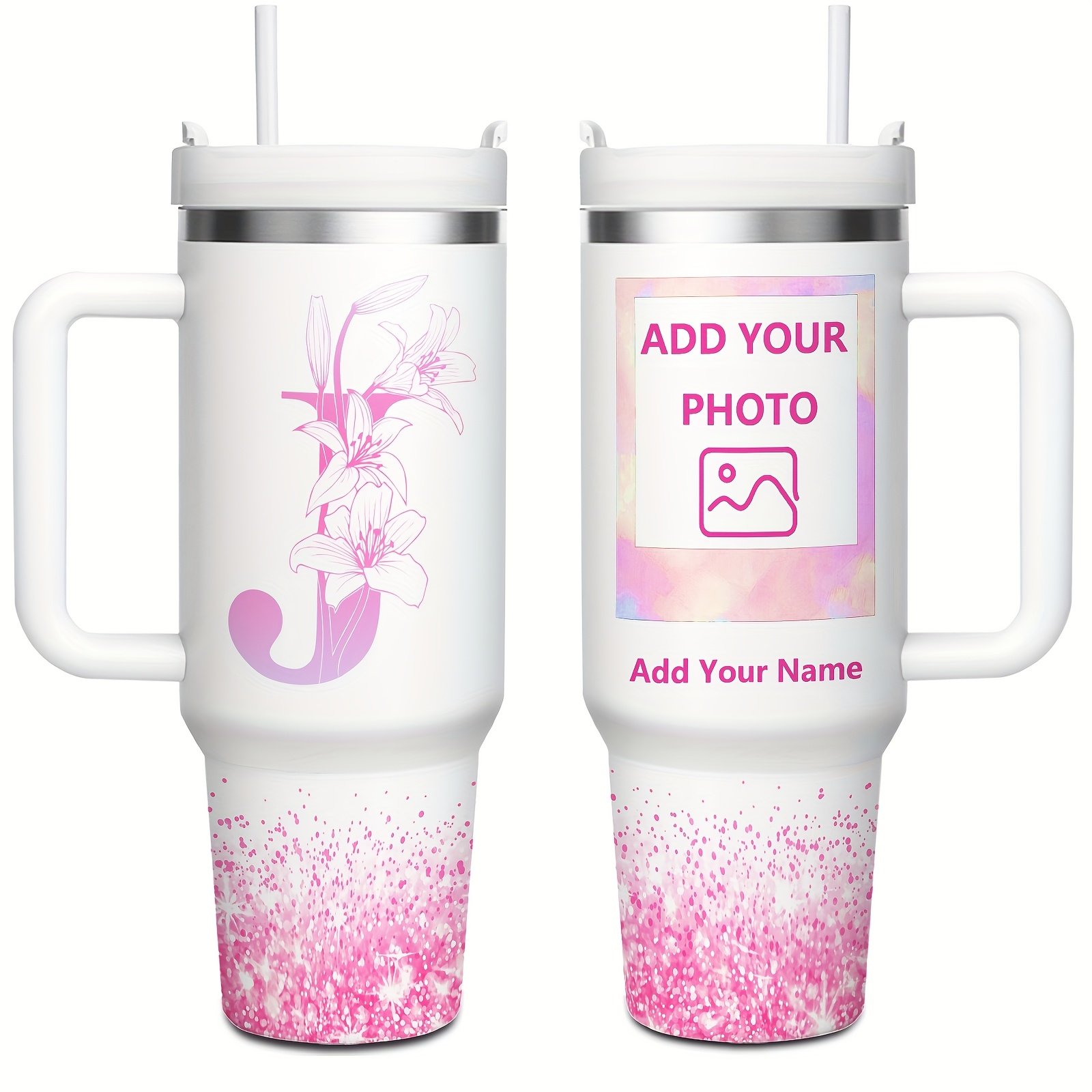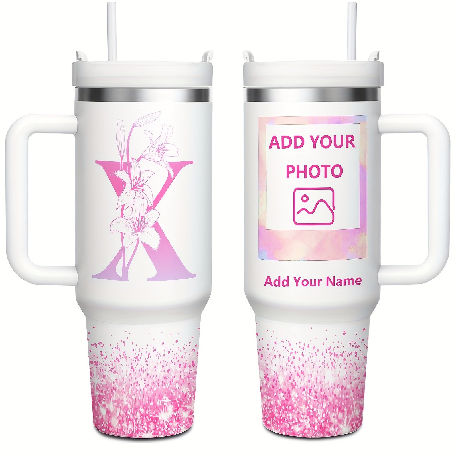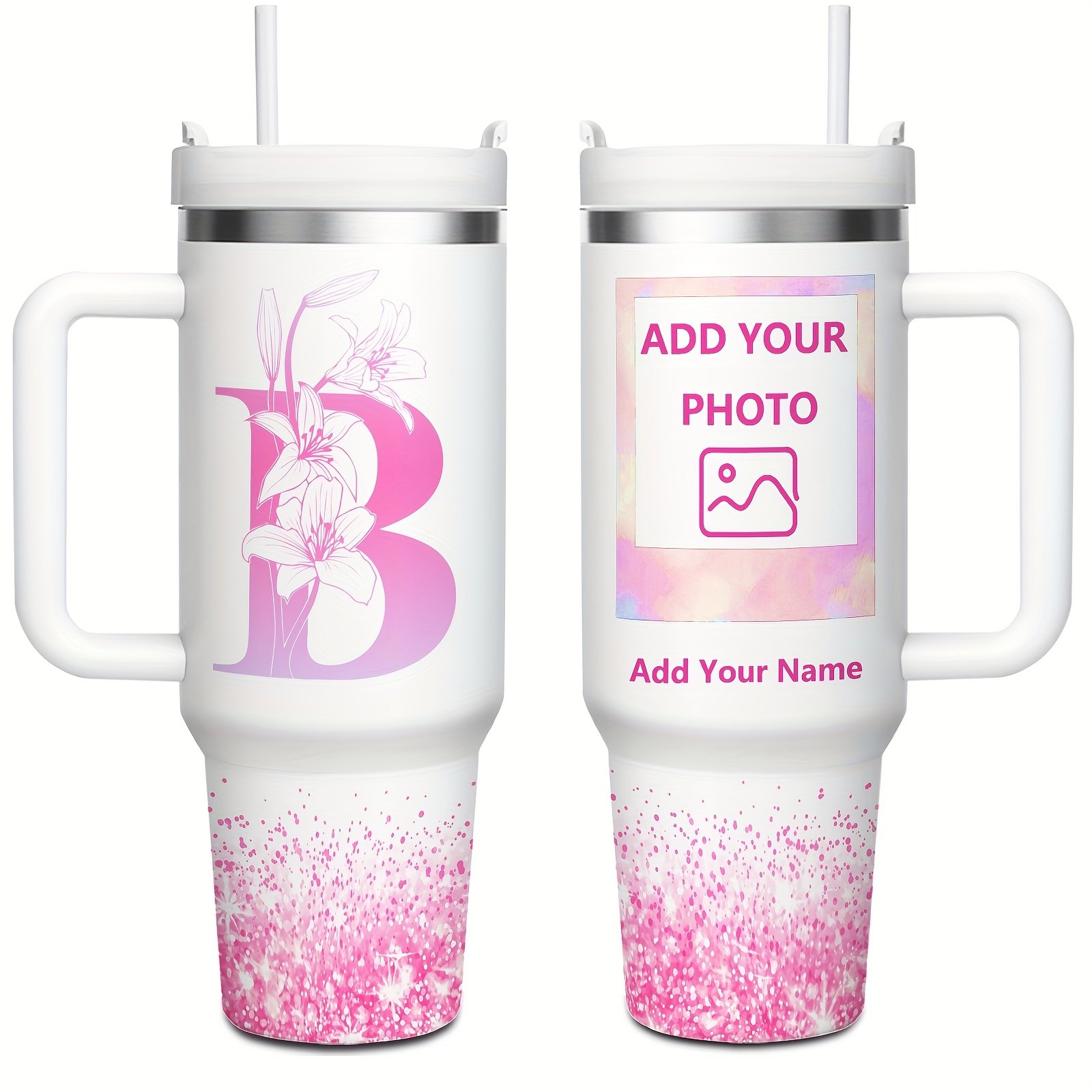 1pc 16oz/40oz Custom Photo And Name Stainless Steel Vacuum Mug with Lid And Straw, Keeps Hot 6h Cold 12h, A-Z Floral Letters, Great Gift for Women, Friends, Mom, Nurses, Perfect for Holidays, Kitchen Accessories, Multi-purpose, Independence Day Gift