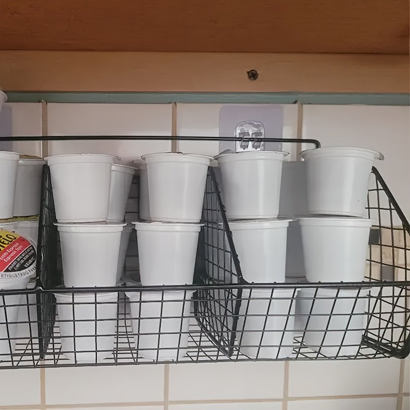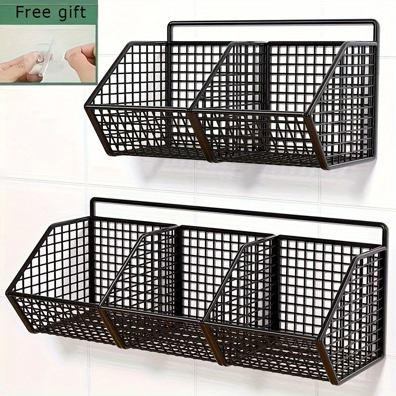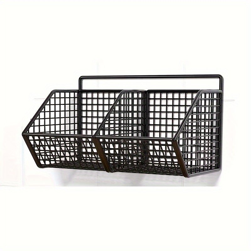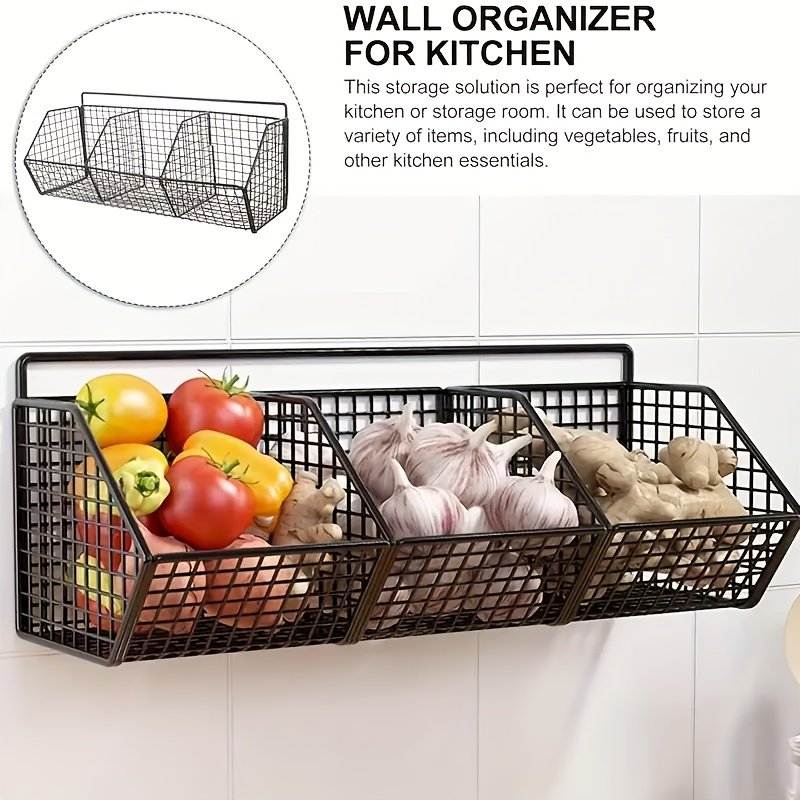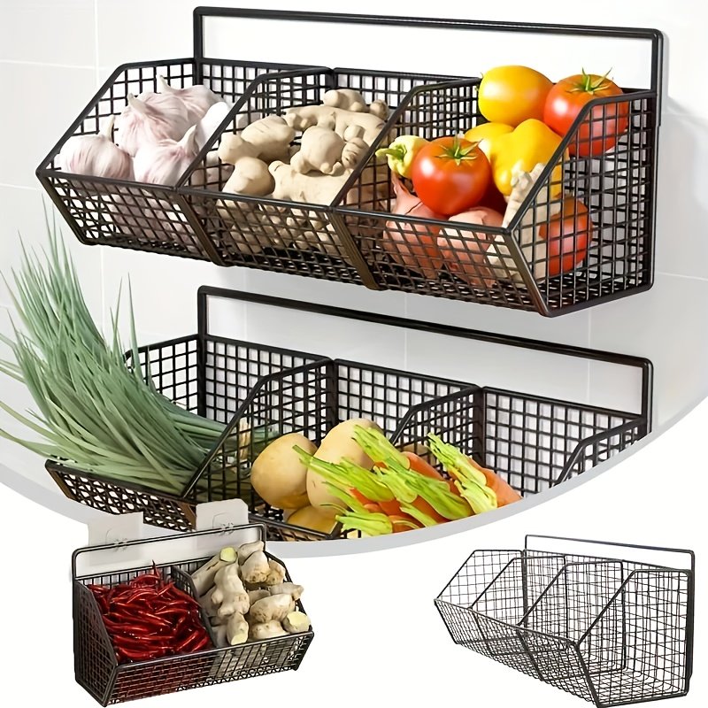 2/3 Compartment Metal Wall-Mounted Food Storage Basket - Modern Black Wire Organizer for Onions, Ginger, Vegetables & Kitchen Tools - Durable, Space-Saving Design with Adhesive Strips for Easy Installation, Kitchen Storage Solution|Modern Kitchen Accessor