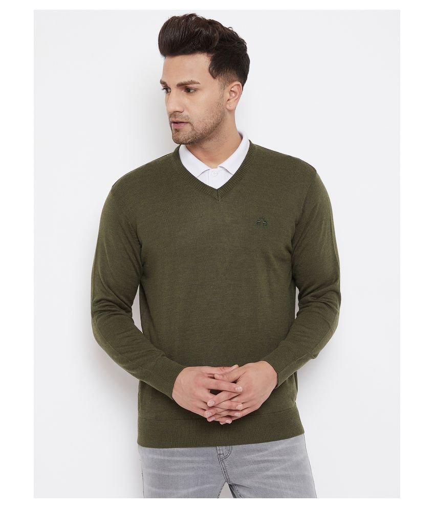 98 Degree North’s Wool Blend Olive Solid V Neck Full Sleeve Pullover Sweater