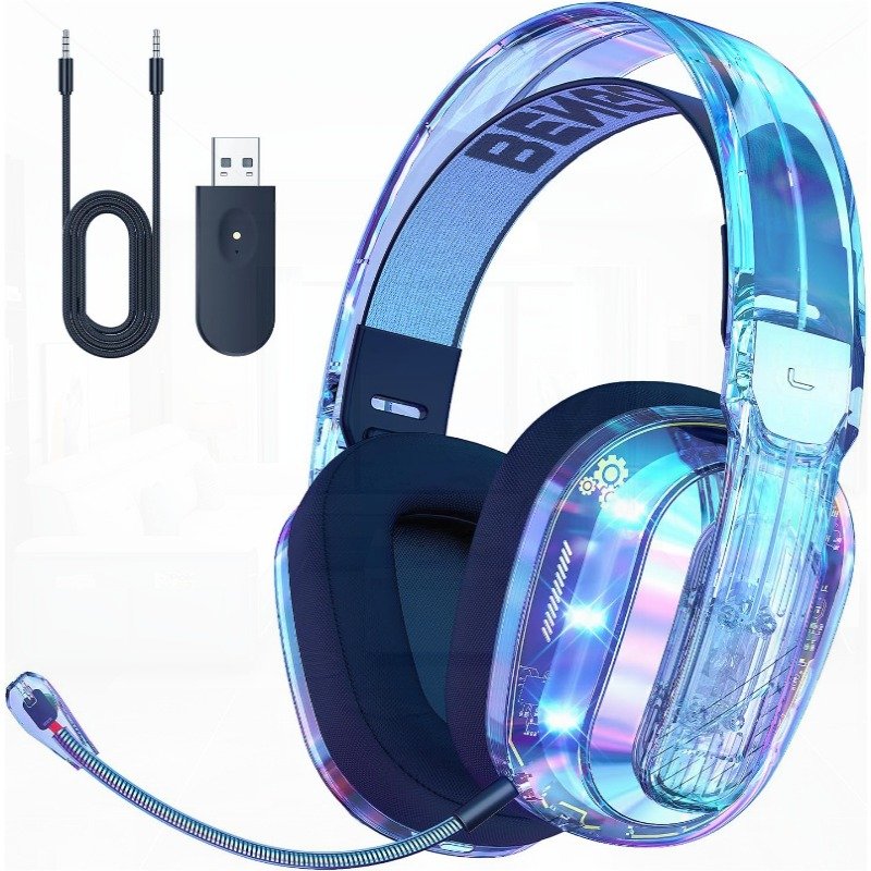 BENGOO Wirel Gaming Headset for PS5 PS4 PC Switch 2.4GHz USB Over Ear Gaming Headphones with Crystal RGB Lights Bluetooth 5.3 Noise Isolating Microphone 3.5mm Wired for Controller