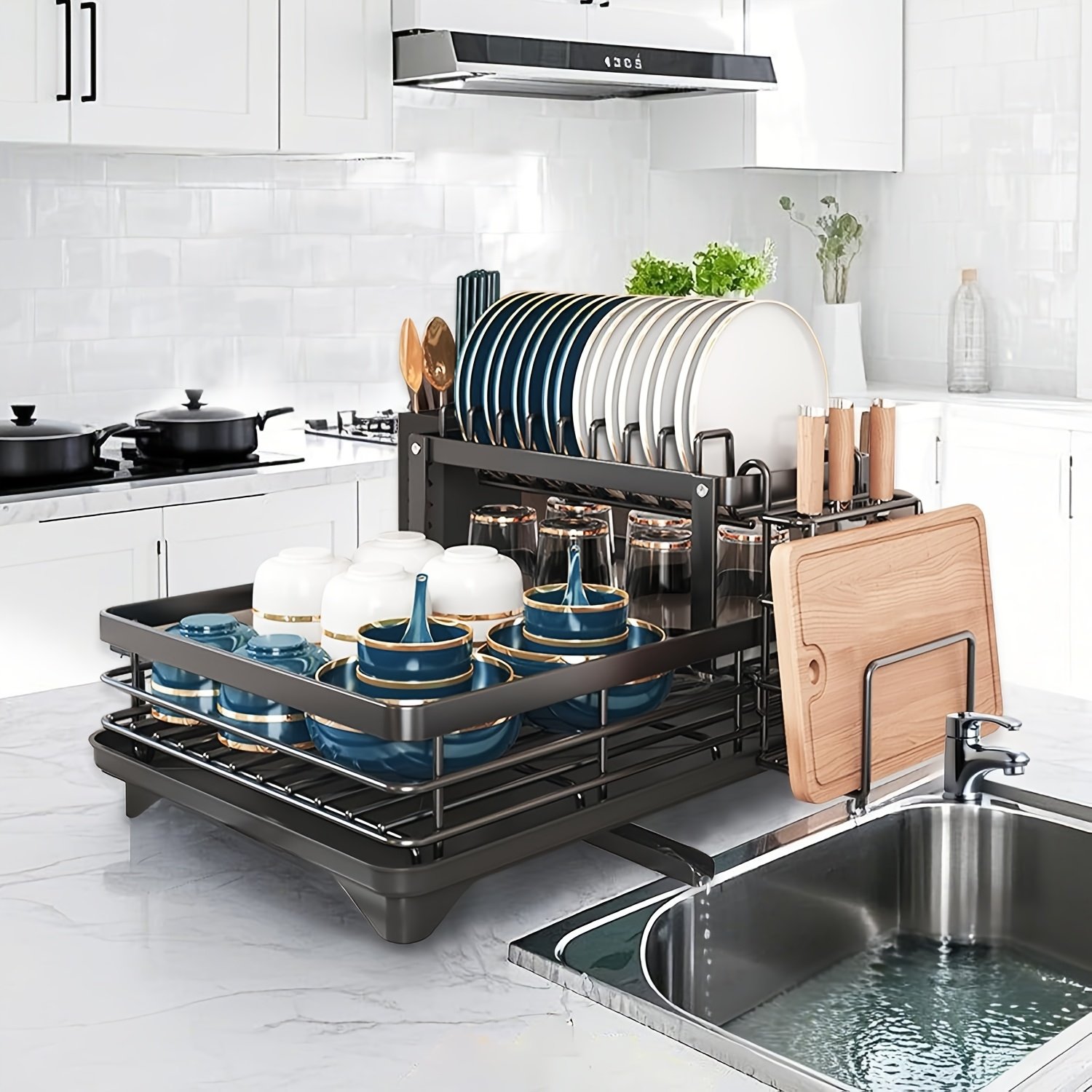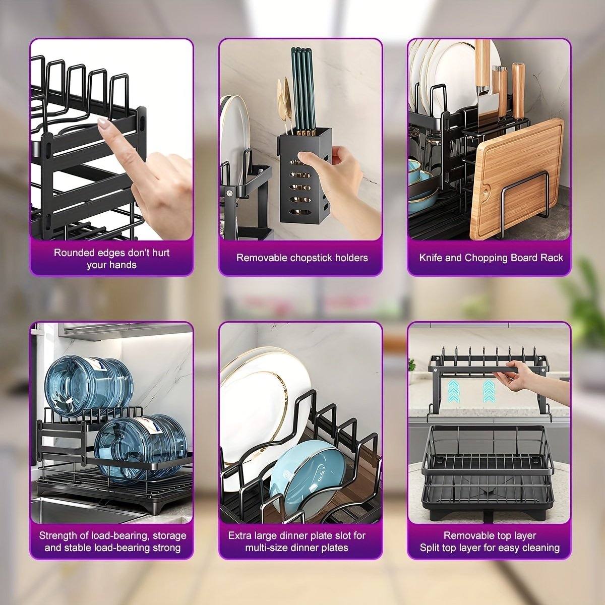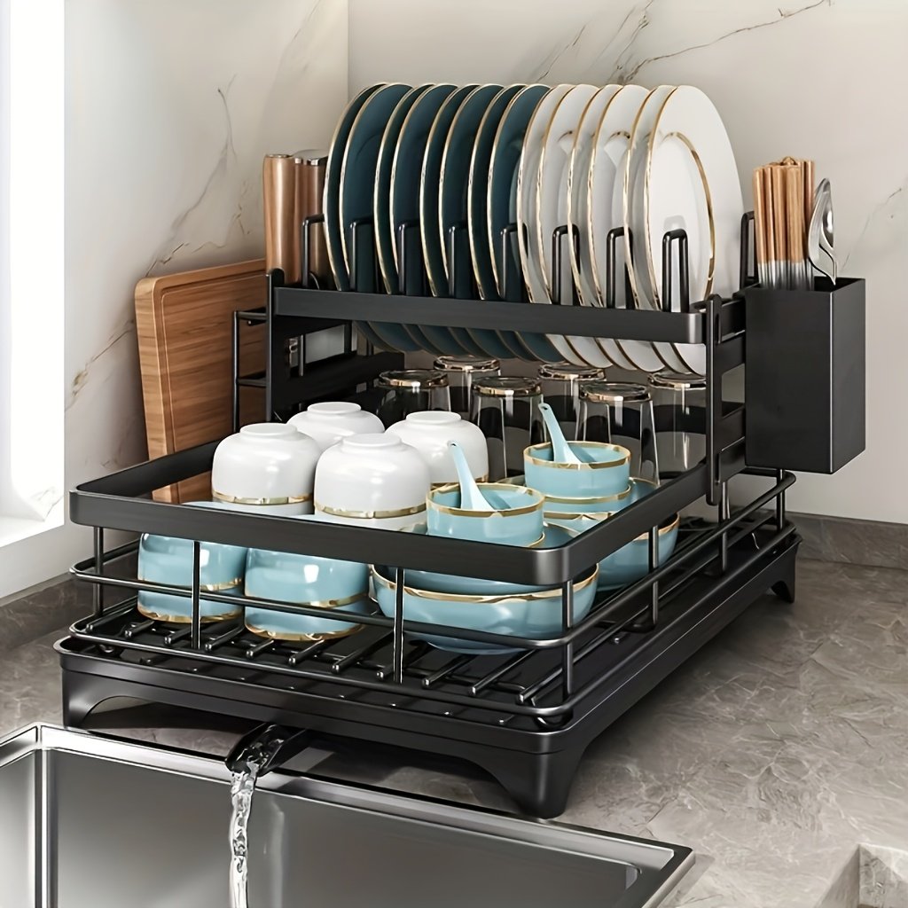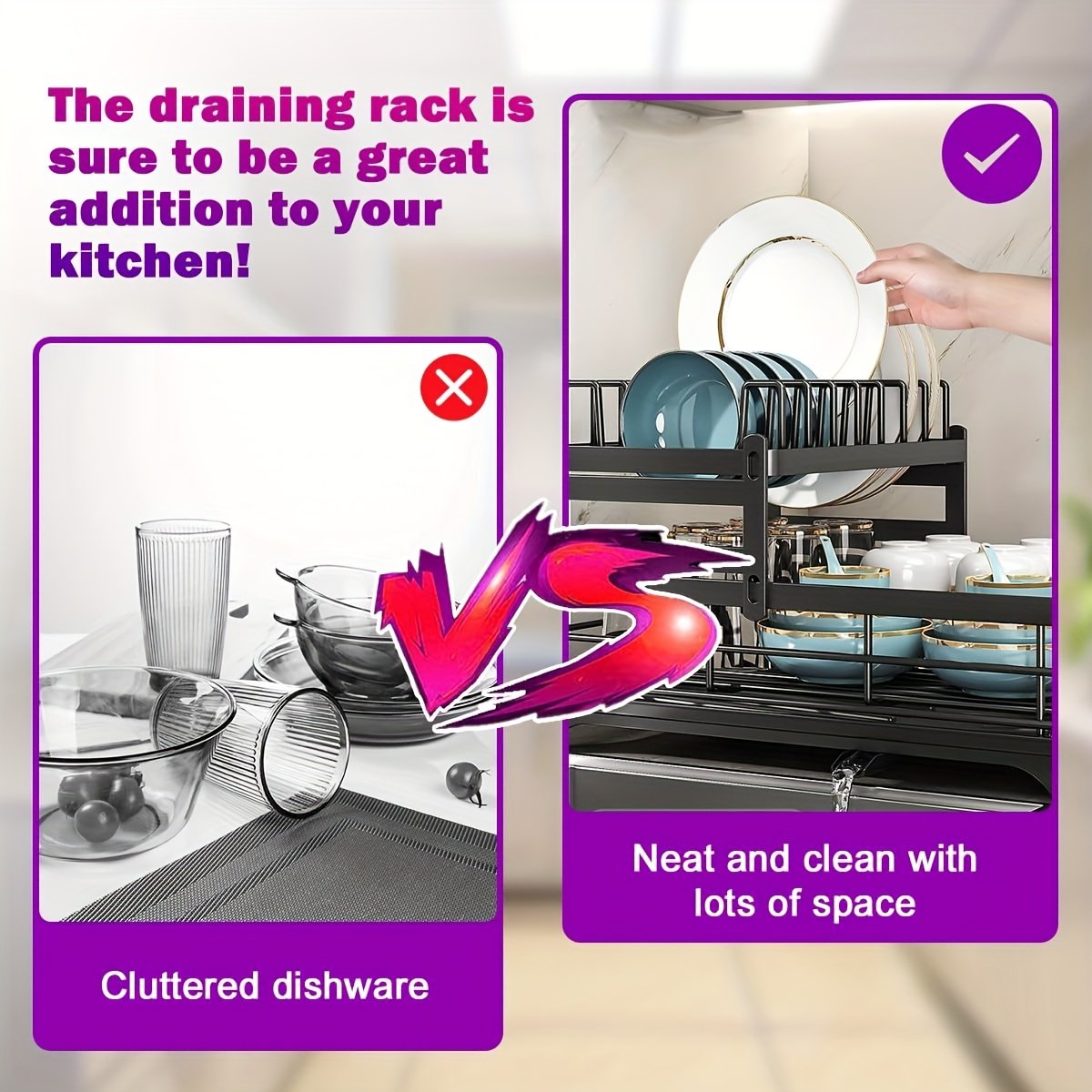 [Dish Rack Organizer] Black Iron One/two floors Foldable Dish Rack - Large Capacity Space-Saving Kitchen Organizer for Dishes, Pots, Pans & Utensils with Drainage System, Sturdy Countertop Storage, Dish Drying Rack