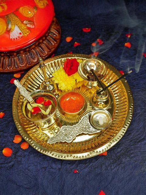 Set content: 8 Pcs (1 Thali Plate, 1 bell, 1 Kalash, 1 Kapoor stand, 1 Spoon, 1 Agarbatti stand, 1 Diya, 1 Chandan bowl)