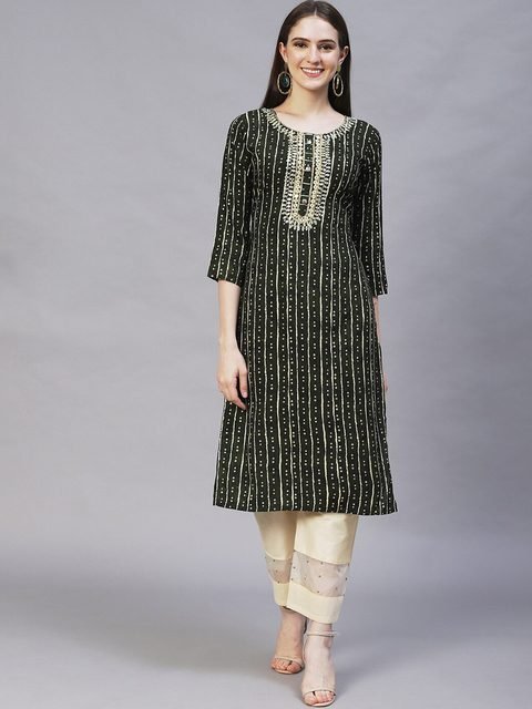 FASHOR Women Green & Beige Geometric Embroidered Kurta