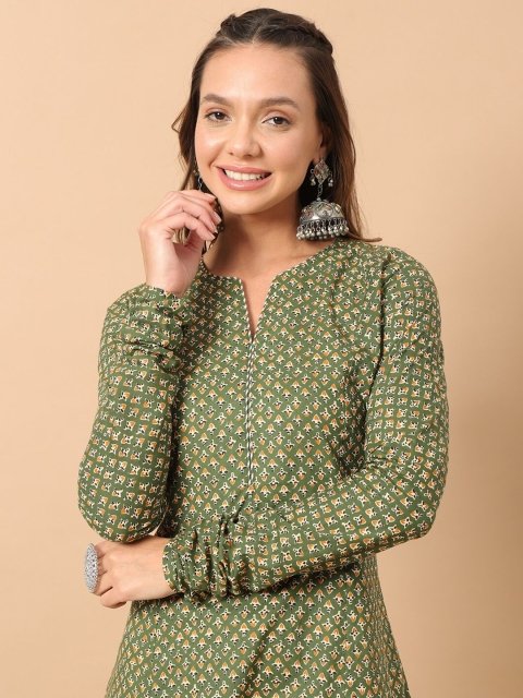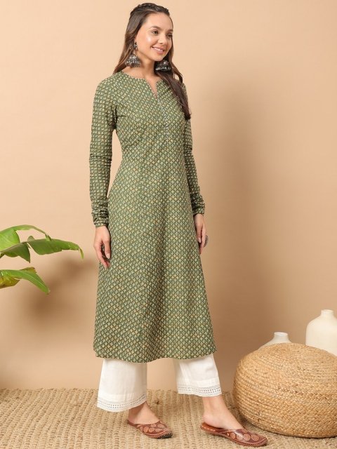 FIORRA Floral Printed Notch Collar Thread Work Cotton A-Line Kurta