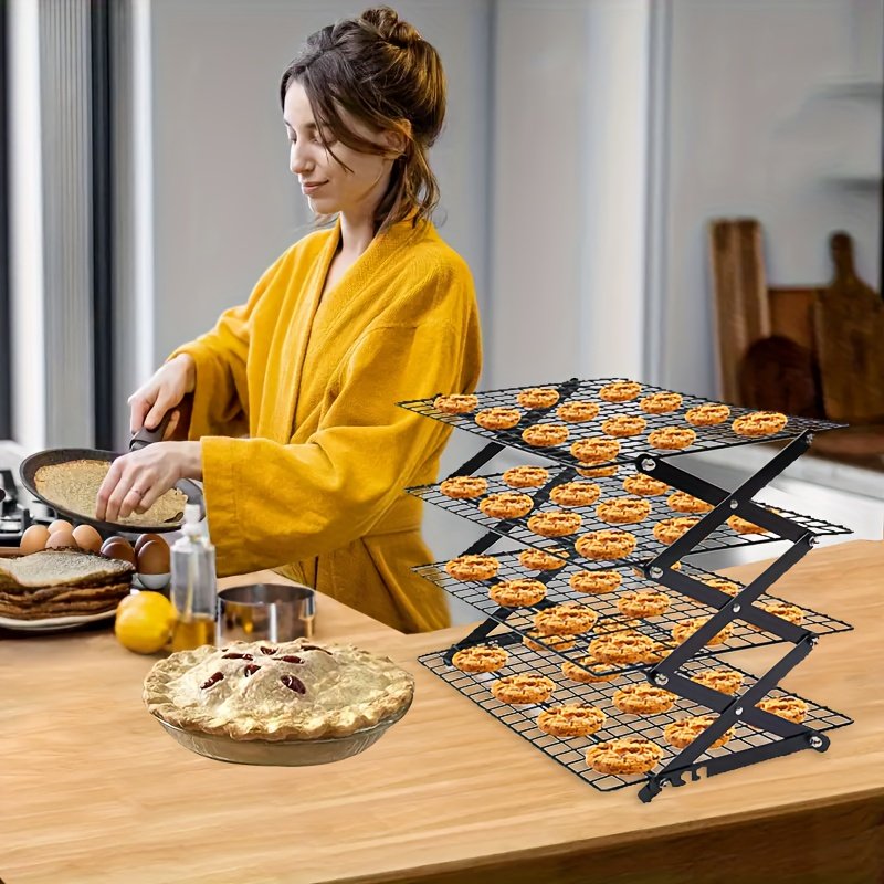 Four-layer Foldable Cooling Rack With Baking Tool Set – Stackable Oven Cookie Cake Drying Rack. BBQ Grill Mesh Tray For Camping, Kitchen Storage & Holiday Baking Gifts Includes Silicone Spatula, Whisk, Tongs, Basting Brush