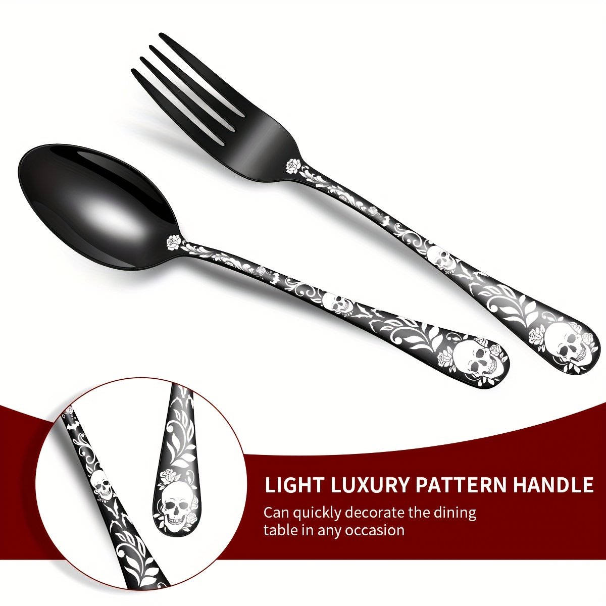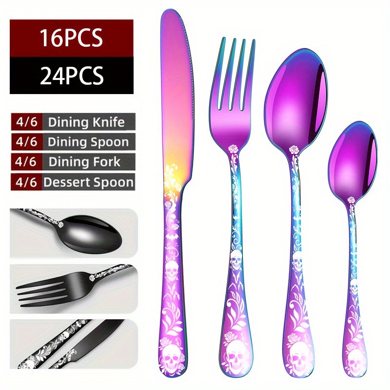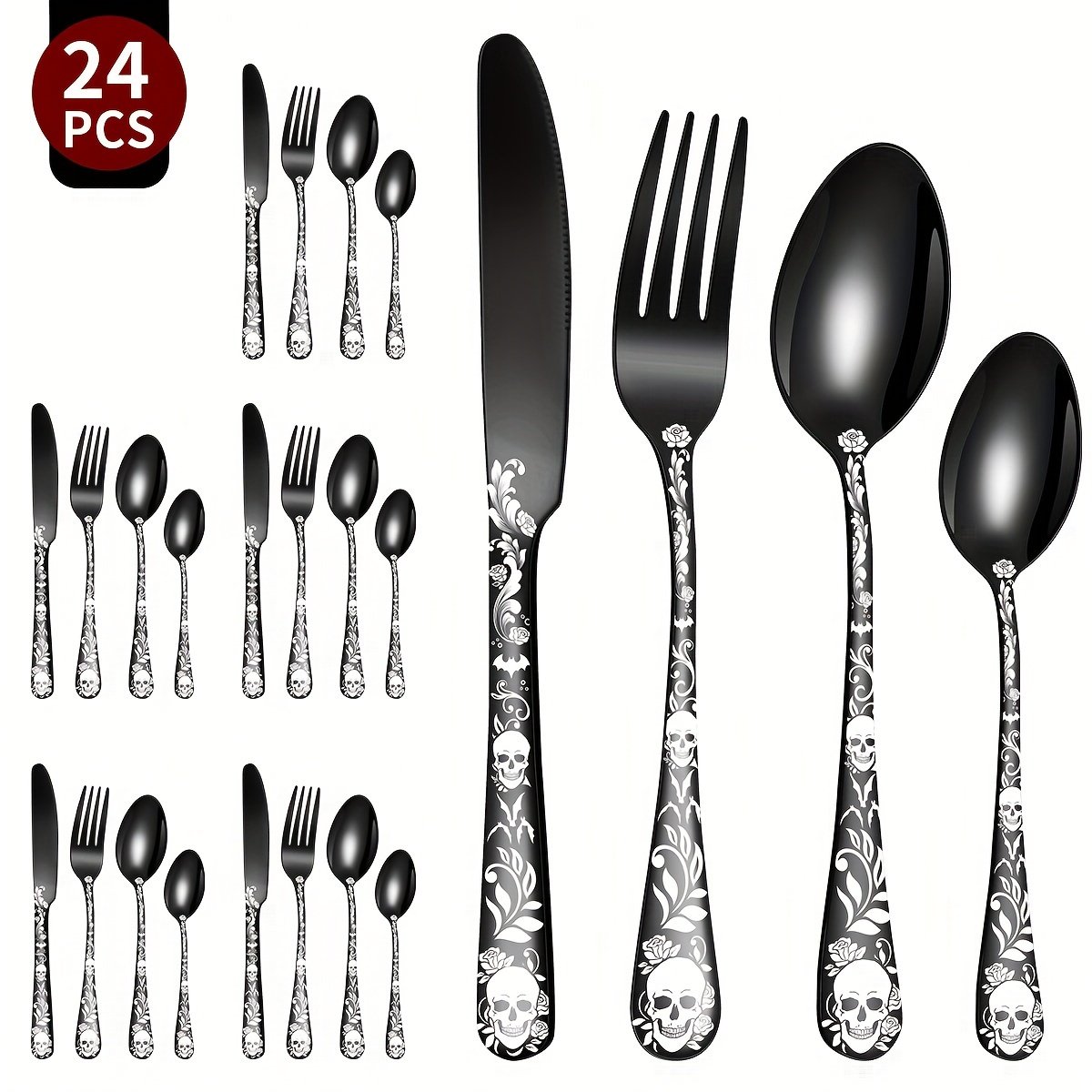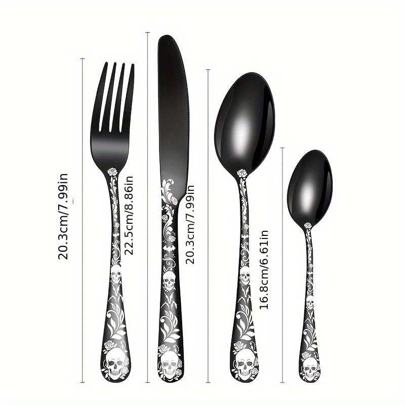 [Gothic Black Skull | Stainless Steel] 16/24pcs Stainless Steel Gothic Black Skull Dinnerware Set | Mirror Finish, Bat Pattern, Floral Double Skull Head, Dishwasher Safe | for Halloween, Day of the Dead, May 5th, Birthday Gift