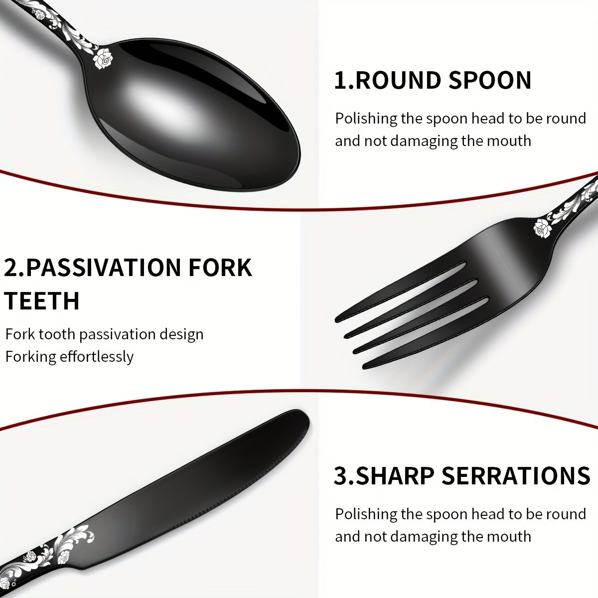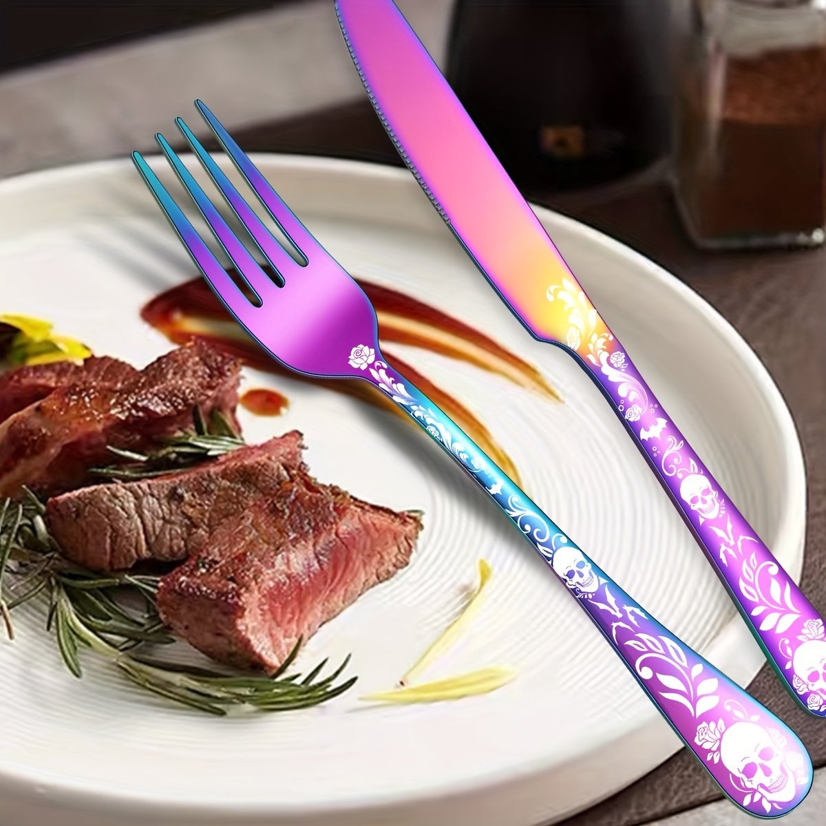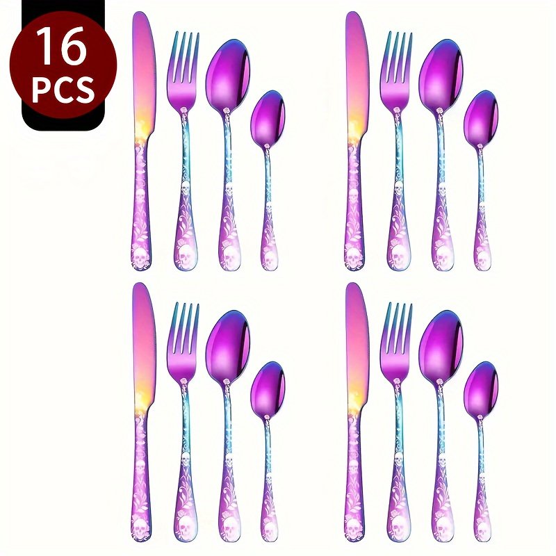 [Gothic Black Skull | Stainless Steel] 16/24pcs Stainless Steel Gothic Black Skull Dinnerware Set | Mirror Finish, Bat Pattern, Floral Double Skull Head, Dishwasher Safe | for Halloween, Day of the Dead, May 5th, Birthday Gift