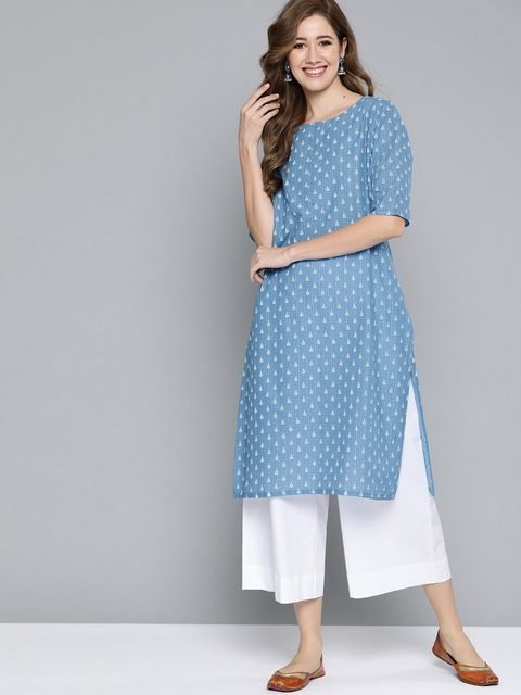HERE&NOW Women Blue & White Ethnic Motifs Printed Straight Kurta