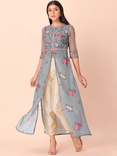 INDYA Women Grey & Pink Floral Printed Georgette Kurta