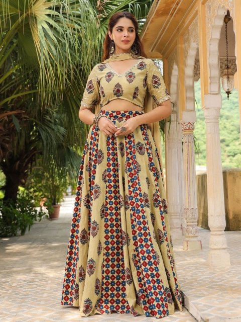 Beige, red and blue printed lehenga choli with dupatta,