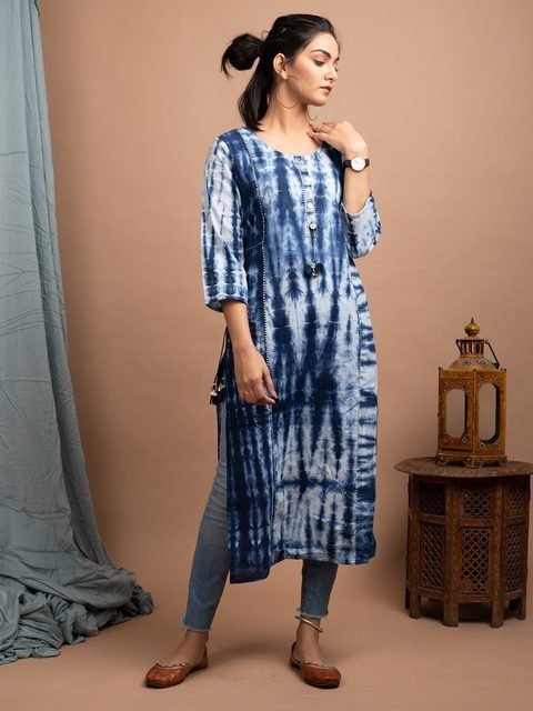 KAAJH Women Blue & White Tie & Dye Cotton Kurta