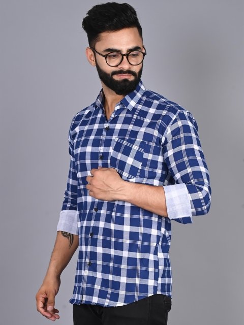 Navy blue & white tartan checked opaque casual shirt ,has a spread collar, button placket, 1 patch pocket, long regular sleeves, curved hem
