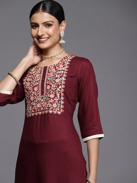 Libas Women Maroon Floral Motifs Yoke Design Pashmina Kurta