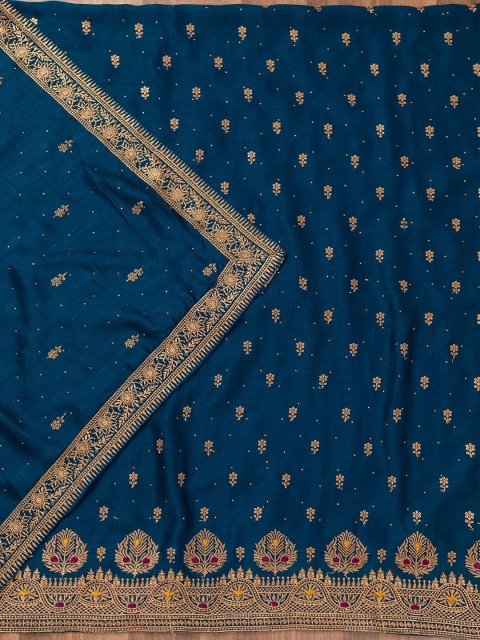 Blue and copper-toned embroidered unstitched dress material