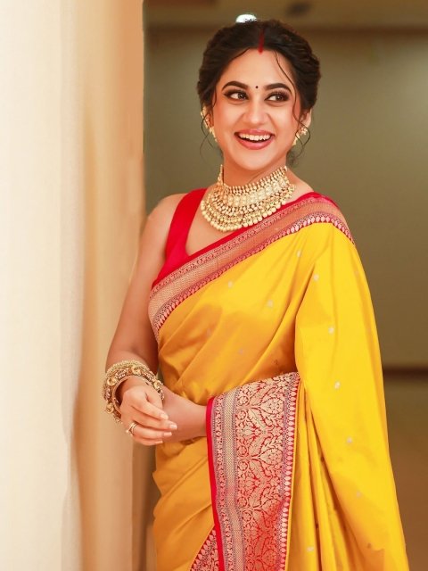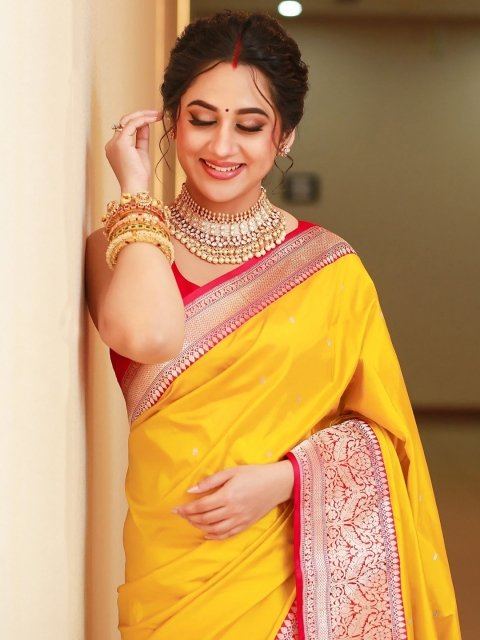 - Yellow and red banarasi saree