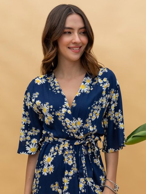 - Blue floral print wrap dress