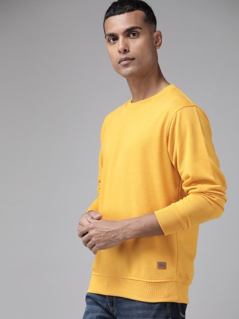 Golden yellow solid sweatshirt has a round neck, long sleeves, closure, ribbed hem