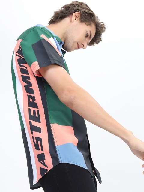 Green colourblocked opaque Casual shirt ,has a spread collar, button placket, short regular sleeves, curved hem
