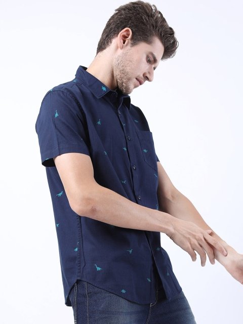 Navy blue conversational printed opaque Casual shirt ,has a spread collar, button placket, 1 pocket, short regular sleeves, curved hem