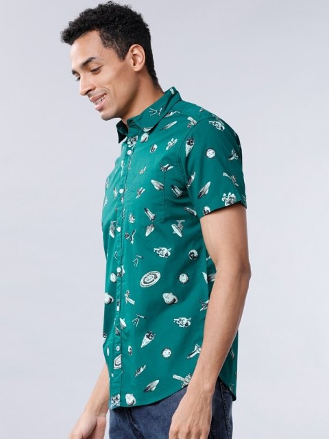 Teal printed casual shirt, has a spread collar, short sleeves, button placket, curved hem, and 1 patch pocket