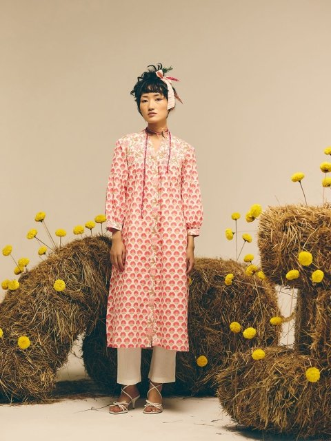 Mandarin V- neck collared kurta with button up front and double placket. Gathered seam at the front and back yoke. Sleeves with gathers on cuff. Attached lining.