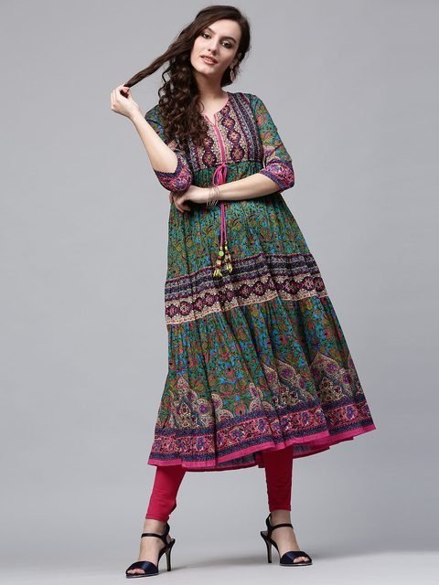 Rain & Rainbow Women Green & Pink Printed Anarkali Kurta