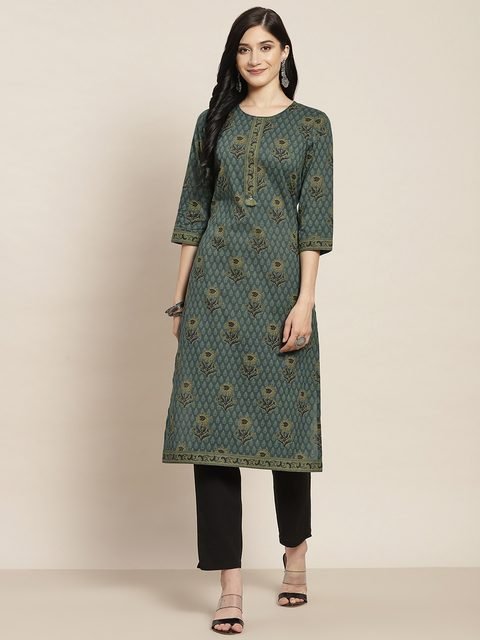 Rain & Rainbow Women Teal & Olive Green Floral Printed Kurta