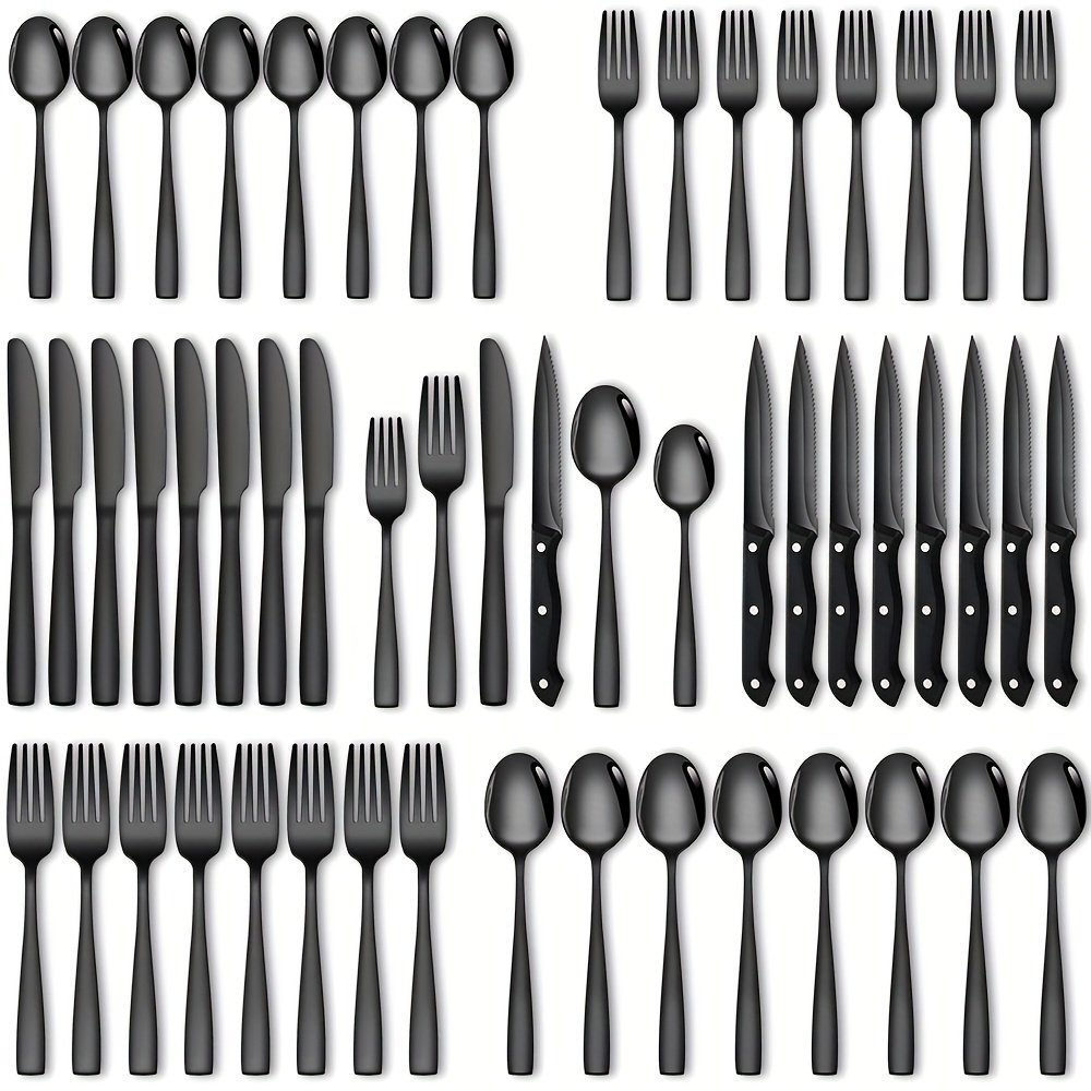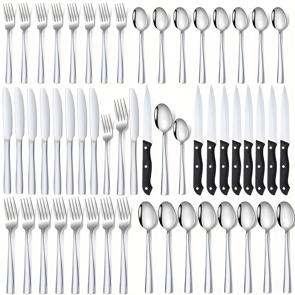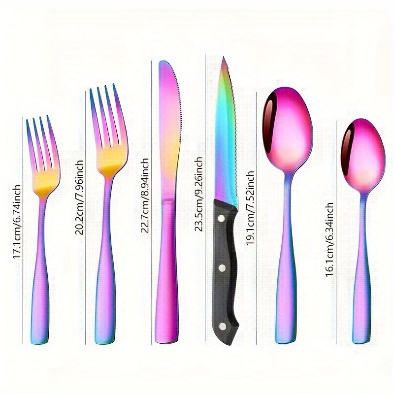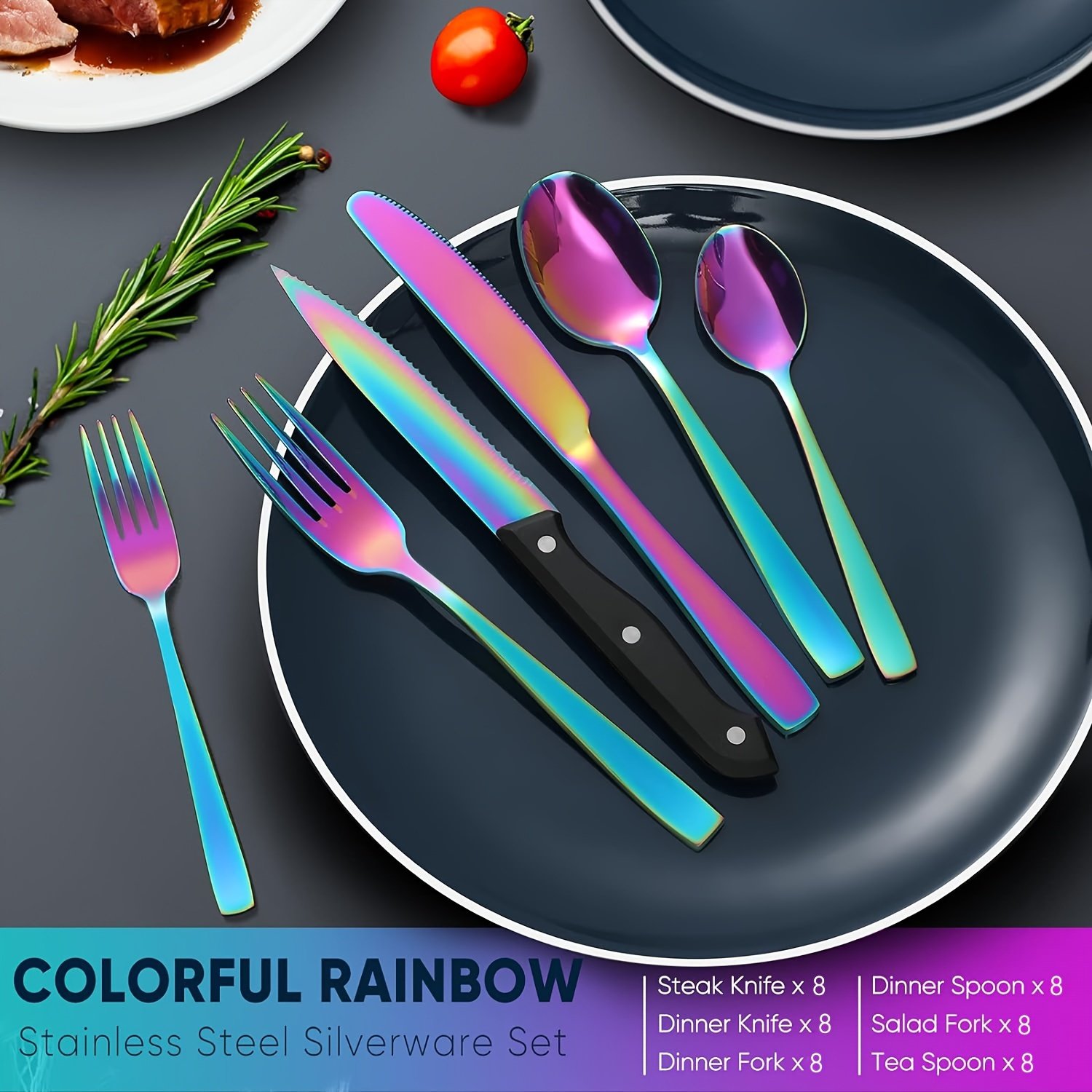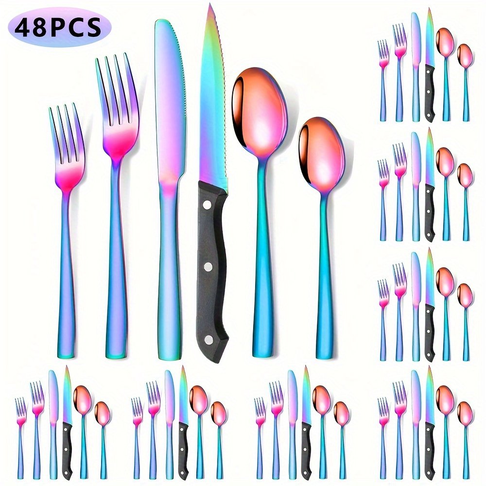 [Rainbow Cutlery] 48pcs Stainless Steel Rainbow Cutlery Set | with 8 Steak Knives – Tableware Set for Home, Parties, and Restaurants – Dishwasher Safe Silverware Set, Mirror Polished Flatware Set