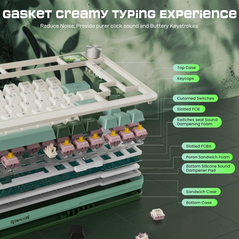 Redragon K708 Pro Wireless Mechanical Gaming Keyboard Gasket Mounted RGB Backlit 81 Customizable Keys 3 Mode 2 4G Bluetooth USB Hot Swap Pre Lubed Switches Screen Control Knob White Green