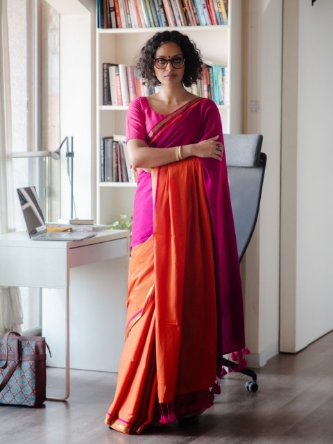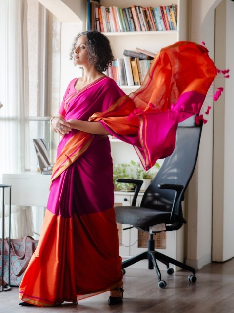 This Charming Orange And Pink Saree From Suta Is 5.5 Metres Long. The Saree Does Not Come With A Readymade Blouse As Donned By The Model In The Picture.