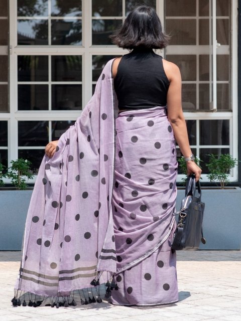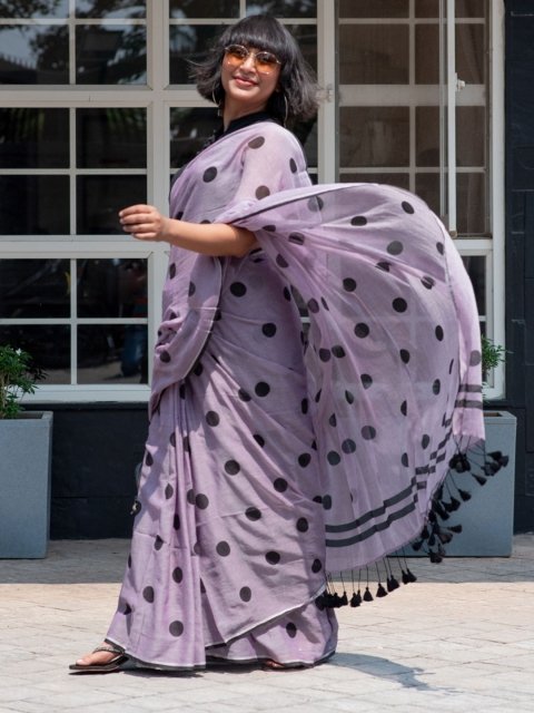 Suta Lavender & Black Polka Printed Pure Cotton Saree