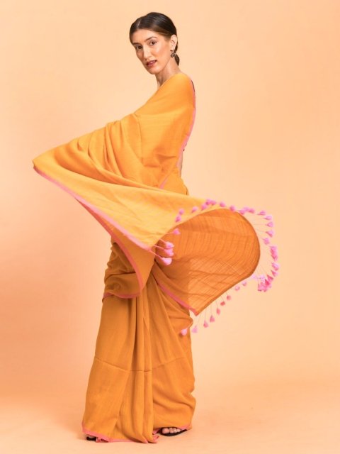 This charming Orange color saree’s drape is 5.5 meters long. The Saree does not come with a readymade blouse as donned by the model in the picture; But can be purchased separately from Suta.