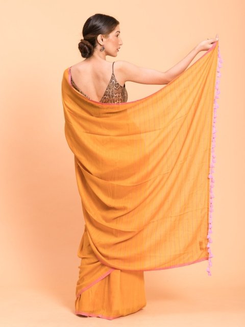 Suta Mustard Yellow & Pink Cotton Striped Saree