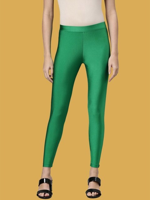 Green solid Ankle-length Shimmer leggings, has an elasticated waistband with slip-on closure